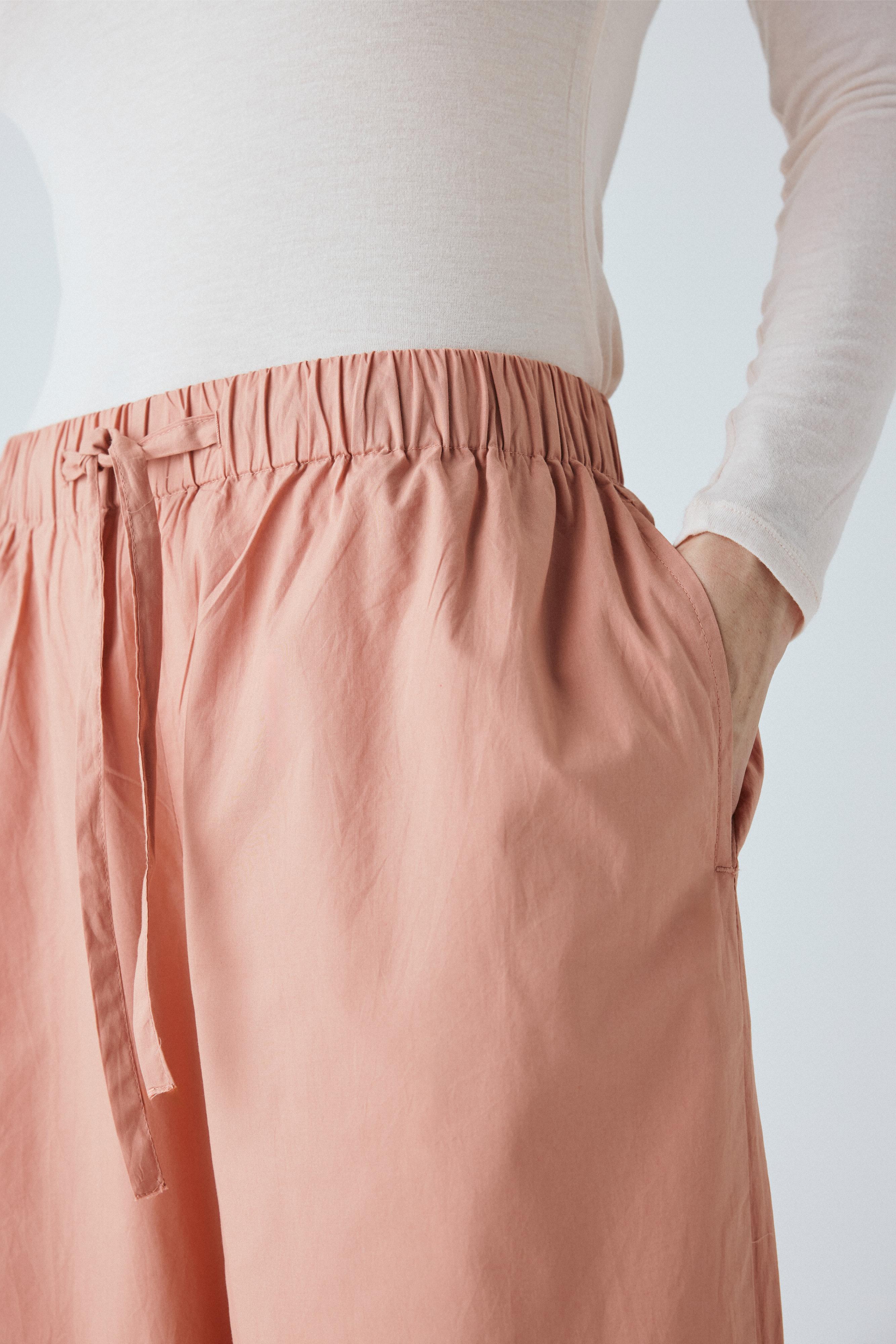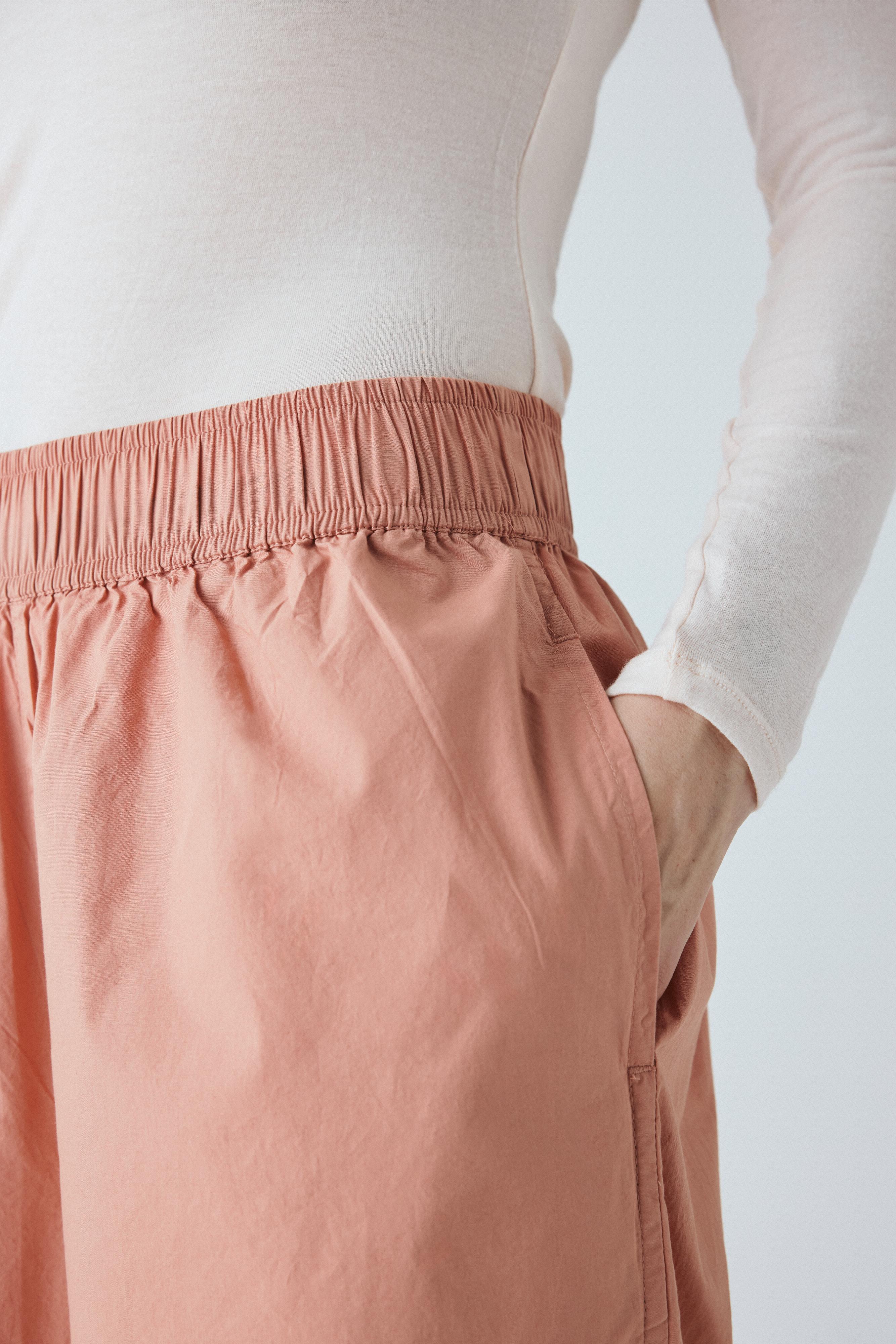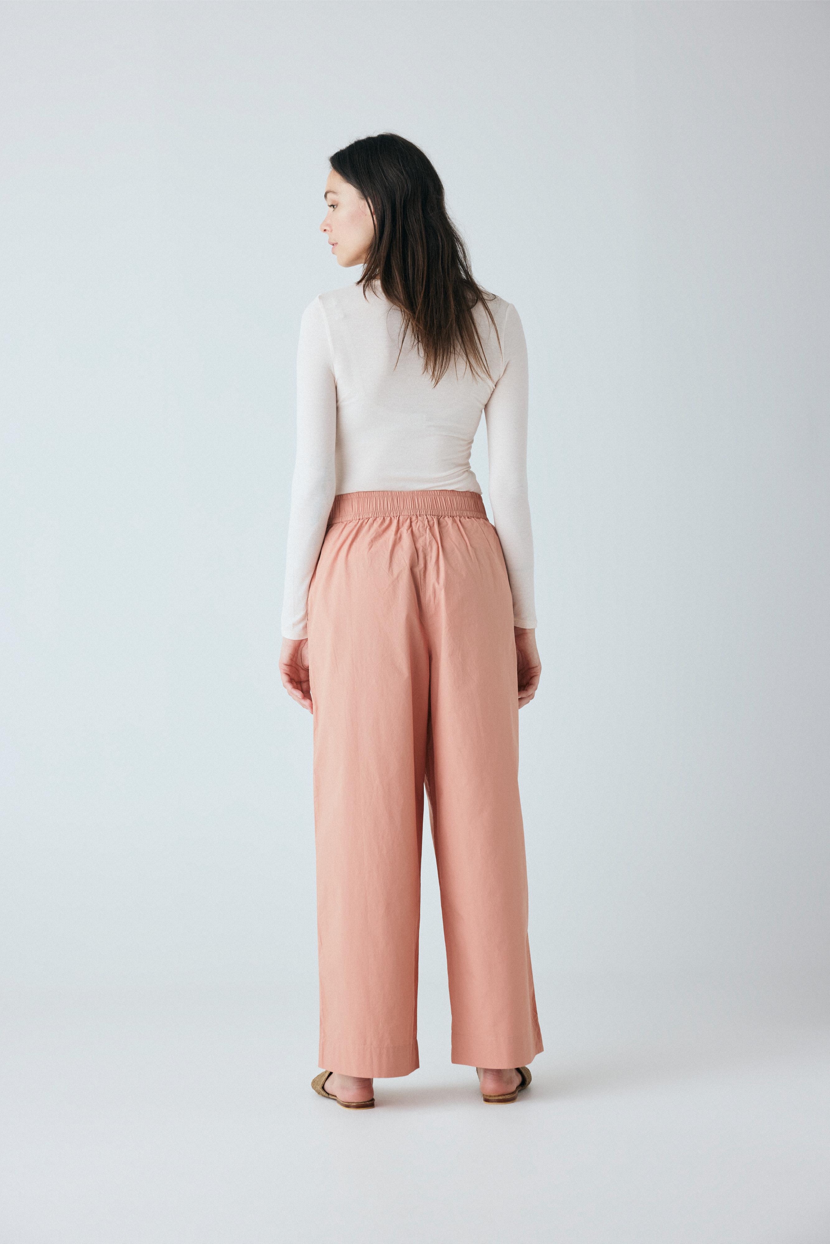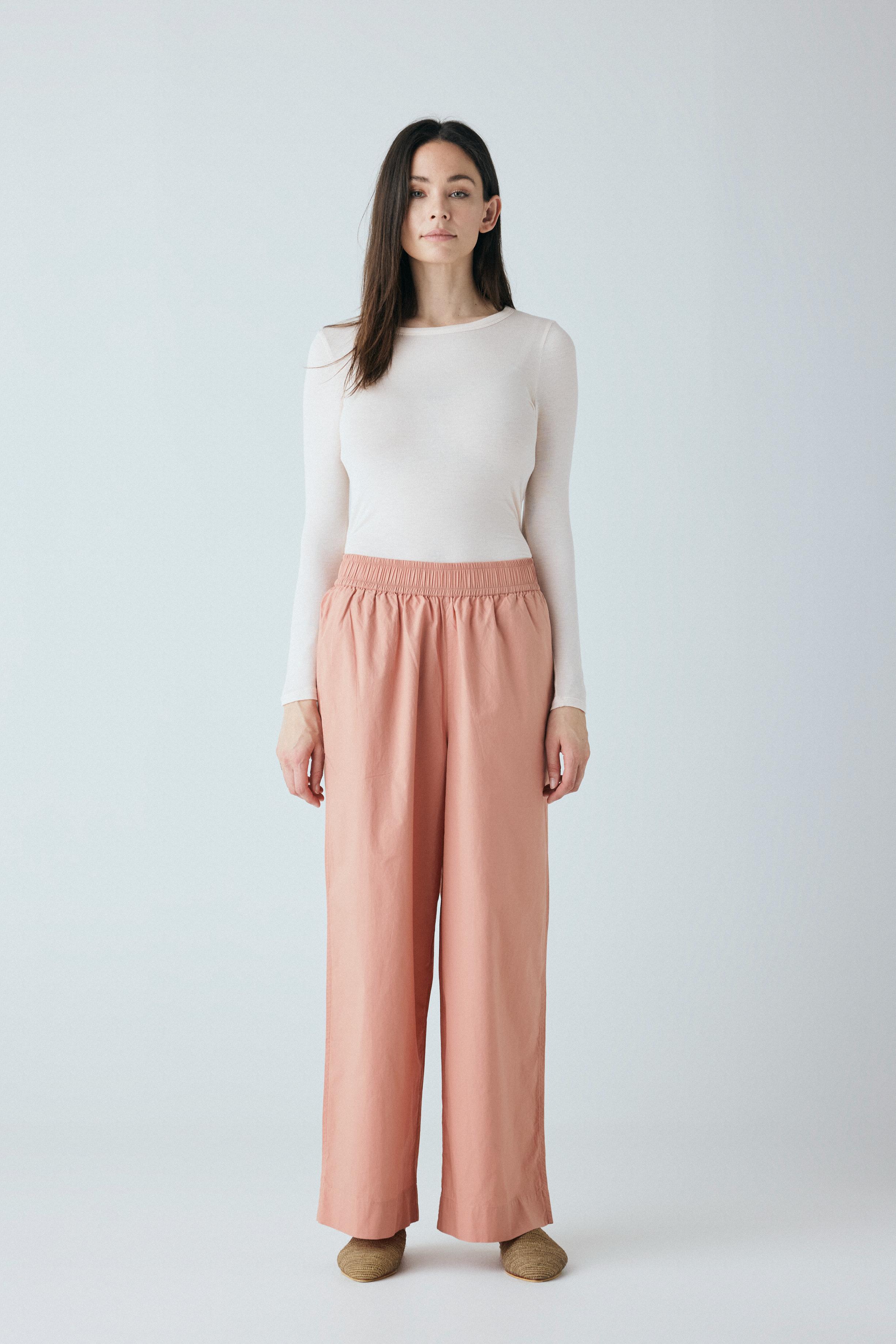 Copenhagen long er enkel med en bred elastik i taljen, usynlige sidelommer og et benforløb med vidde.